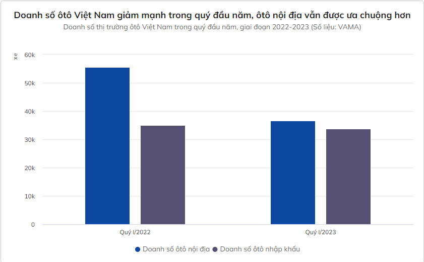 Trong khi đó, ôtô nội địa dù giảm mạnh doanh số so với cùng kỳ năm ngoái vẫn đạt sức tiêu thụ 36.692 xe trong quý đầu năm, nhỉnh hơn gần 3.000 xe so với thành tích bán hàng chung của nhóm ôtô nhập khẩu theo báo cáo của VAMA.